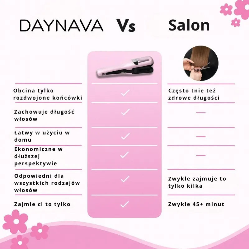 Daynava Split Ends Trimmer celuje tylko w uszkodzone końcówki, pozostawiając włosy zdrowe, gęste i niesamowicie gładkie.